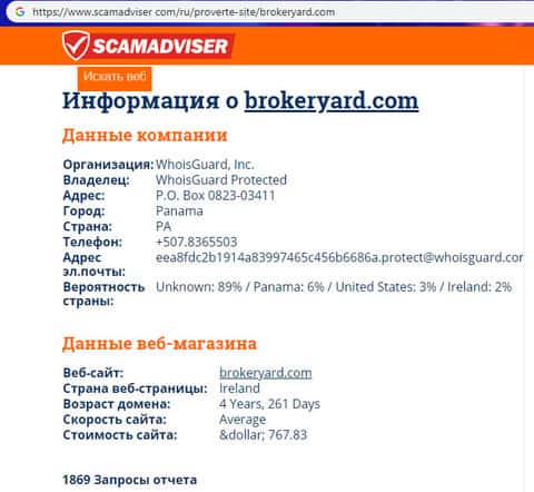 В связи с противозаконной и мошеннической деятельностью аферисты Брокер Ярд скрывают имена и контакты своих реальных руководителей. Кроме этого жулики BrokerYard скрывают местоположение сервера своего сайта, а их возраст составляет всего 4 года. На изображении ниже вы можете увидеть информацию о шулерах Брокер Ярд с ресурса scamadviser com.