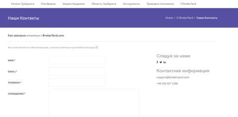 Контакты у аферистов BrokerYard представлены отдельным разделом. Найти их можно в меню шапки сайта. Стоит отметить, что адрес их регистрации не фигурирует у них в контактах, и найти адрес регистрации мошенников Брокер Ярд можно в условиях и положениях. Ниже перечислим контакты очередного лохотрона сети интернет в лице аферистов BrokerYard: