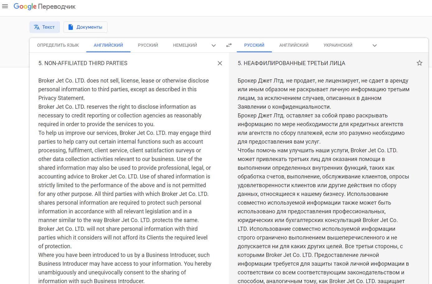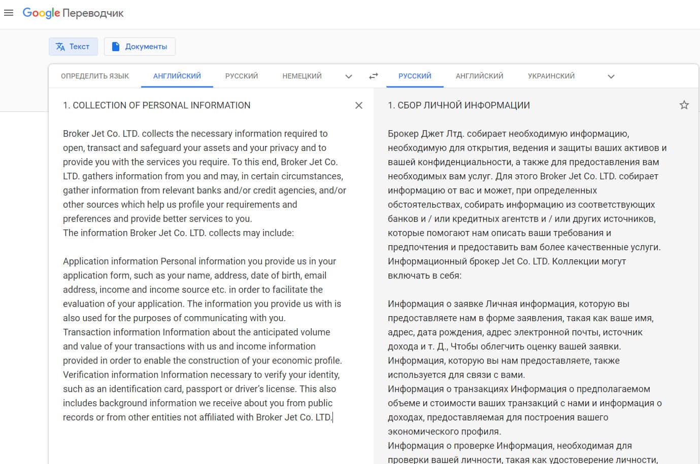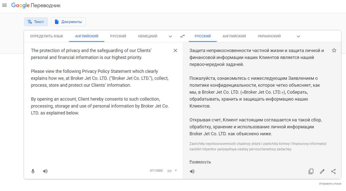 Политика конфиденциальности лохотрона Брокер Джет