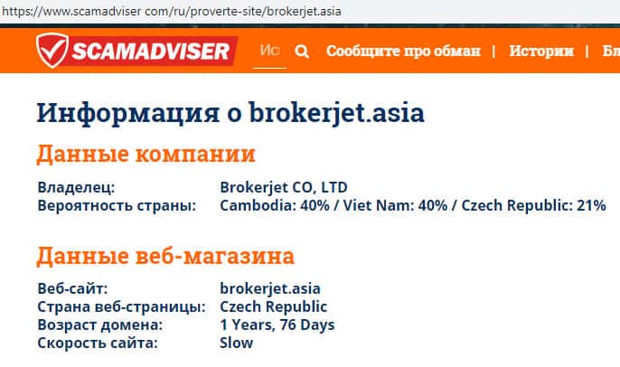 В связи с мошеннической и противозаконной деятельностью лохотрона Брокер Джет его реальные руководители предпочитают анонимность дабы избежать ответственности со стороны правоохранительных органов. Информацию о самом же сайте жулья Brokerjet можно узнать с помощью портала scamadviser com, который вы можете увидеть на изображении ниже.