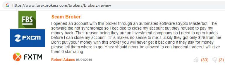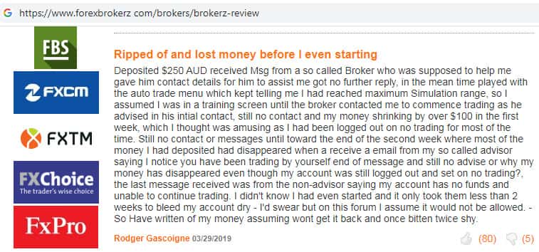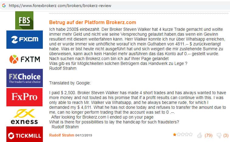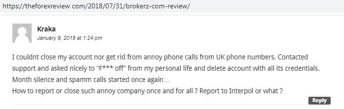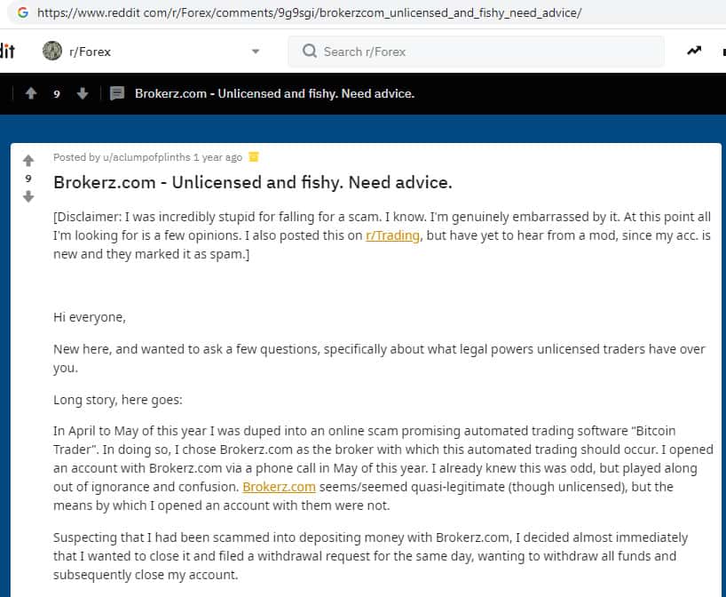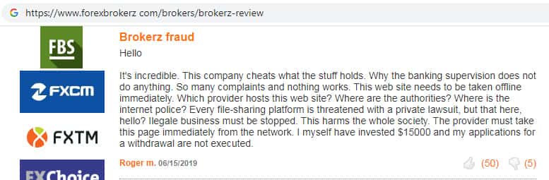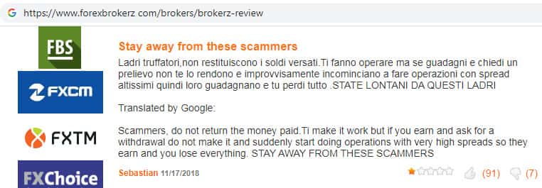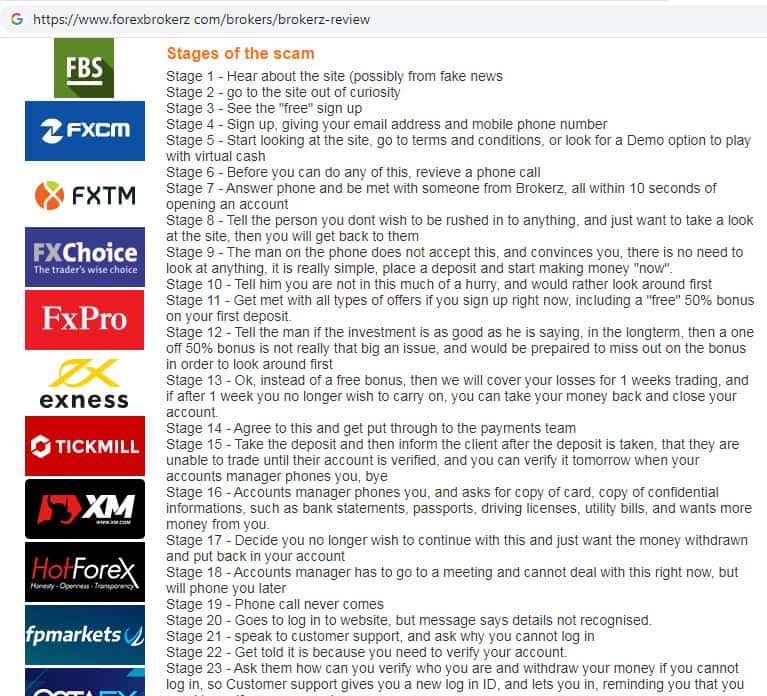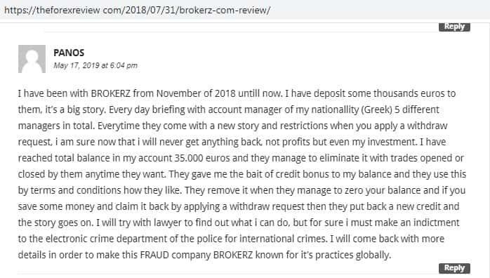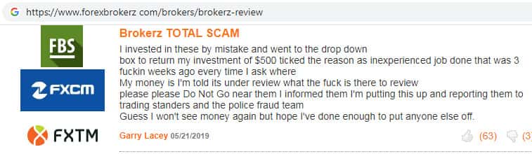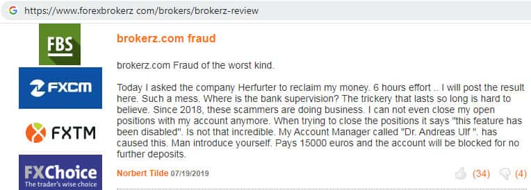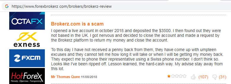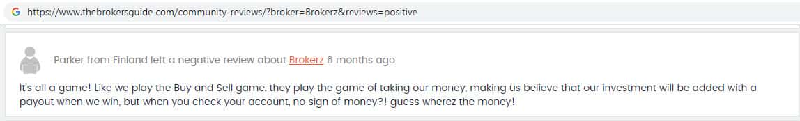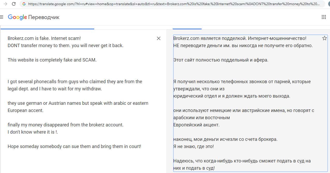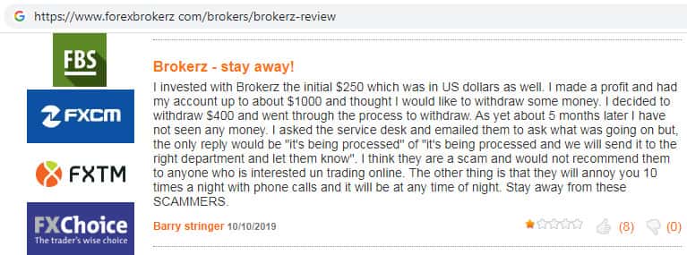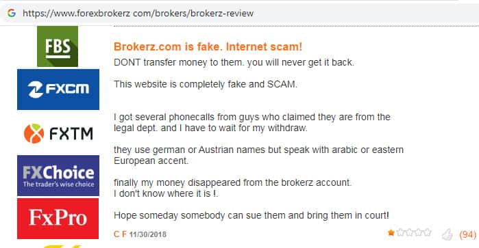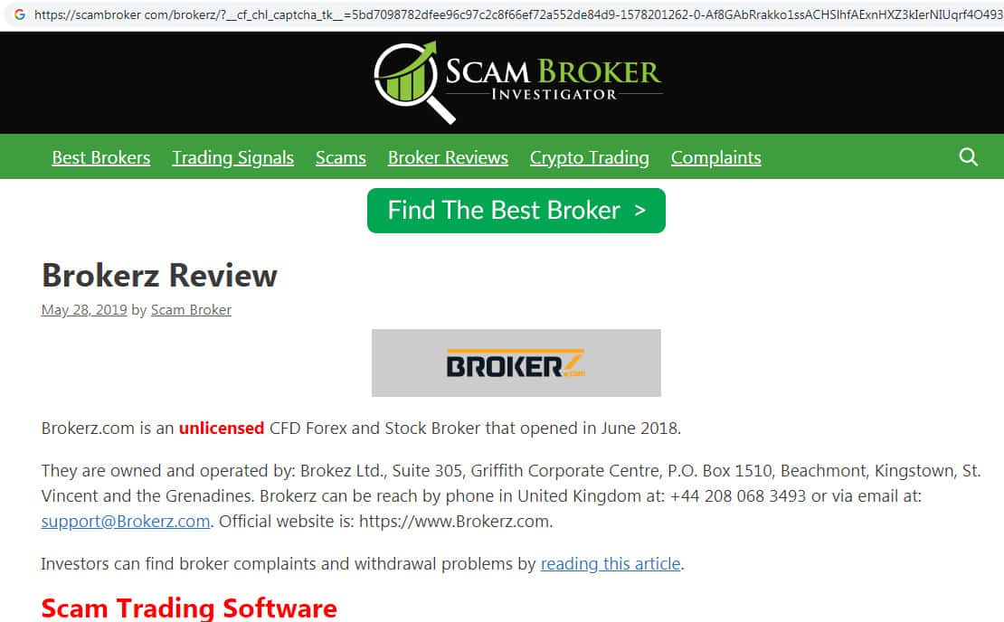 Портал scambroker com в своем обзоре прямо и недвусмысленно называет компанию Брокерз мошенниками и строго отрицает все попытки торговли на их площадке. Автор статьи указывает на отсутствие лицензии на брокерскую деятельность у компании, обязательные платежи за использование ПО, за бездействие трейдера, обязательное количество проведенных трейдером торгов.