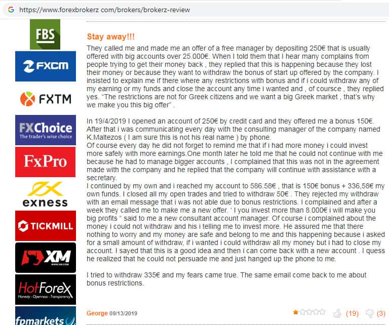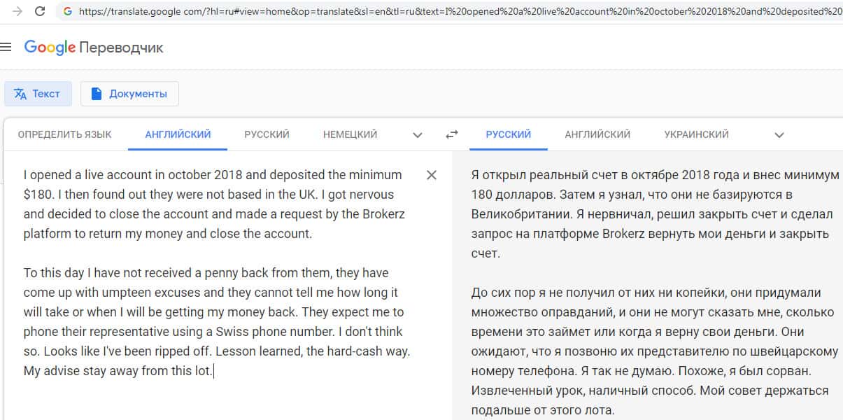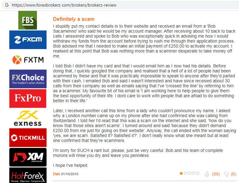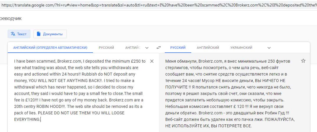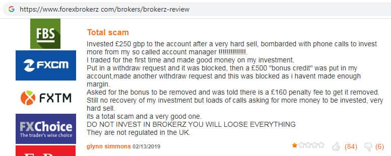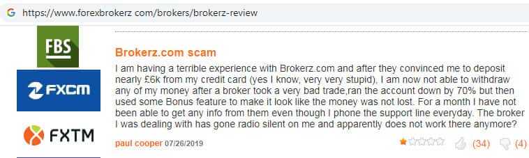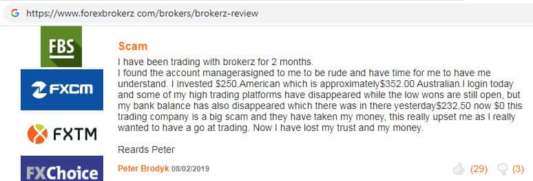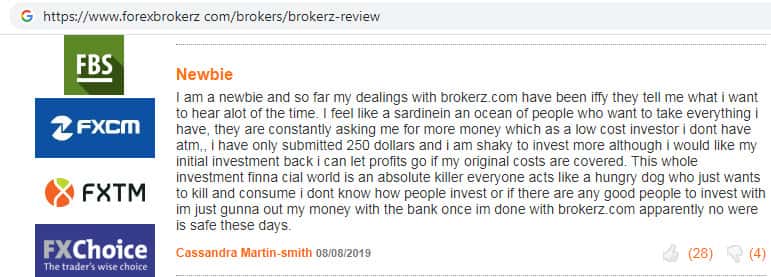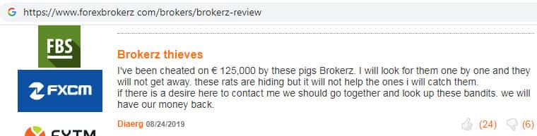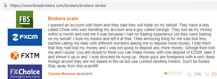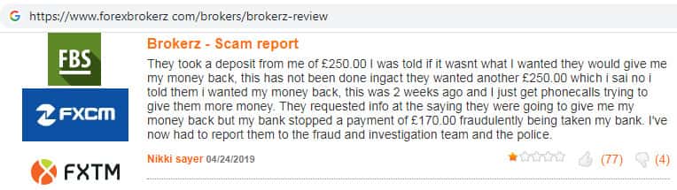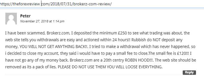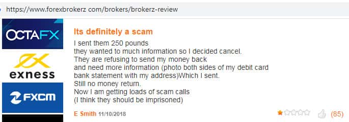 Пользователь E Smith, оставивший отзыв о своём сотрудничестве с брокерской конторой Брокерз, считает, что администрация брокерской компании Брокерз должна сидеть в тюрьме. Он имел неосторожность перечислить на торговый счёт, открытый им в Брокерз двести пятьдесят фунтов.