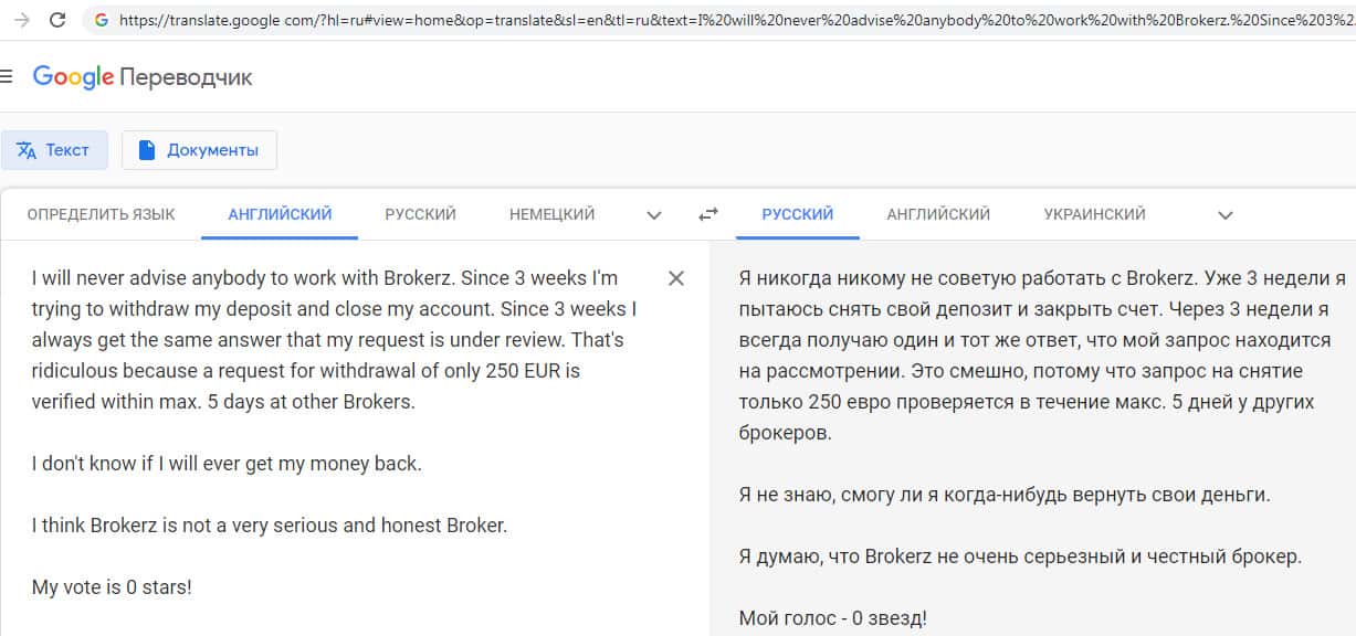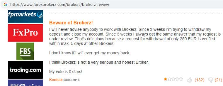 Пользователь Kordula оставил свой отзыв на портале forexbrokerz com о его опыте сотрудничества с брокерской компанией Брокерз. В своем отзыве он нелестно отзывается о брокерской конторе и не советует кому-либо и когда-либо работать с Брокерз. Он уже три недели пытается вывести с брокерской площадки Брокерз каких-то двести пятьдесят евро.