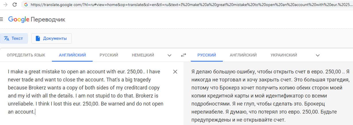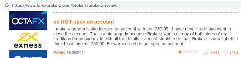 Пользователь Menno на портале forexbrokerz com предупреждает всех пользователей не открывать торговый счет на брокерской площадке Брокерз. Он рассказывает, как сам попал в ловушку к мошенникам и открыл счет на Брокерз, а затем перечислил двести пятьдесят евро.