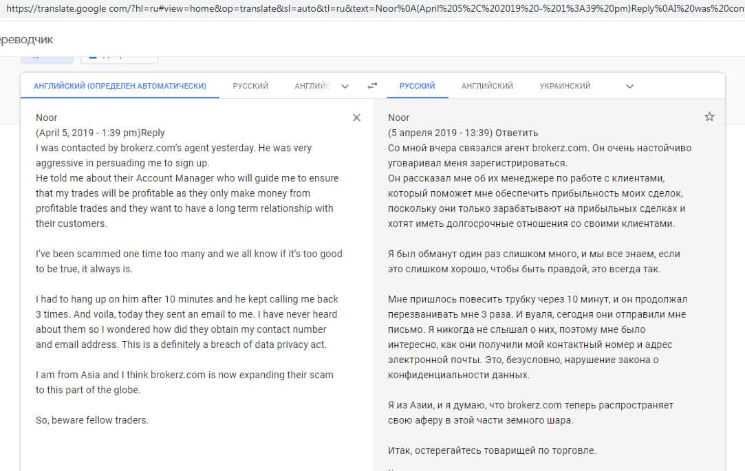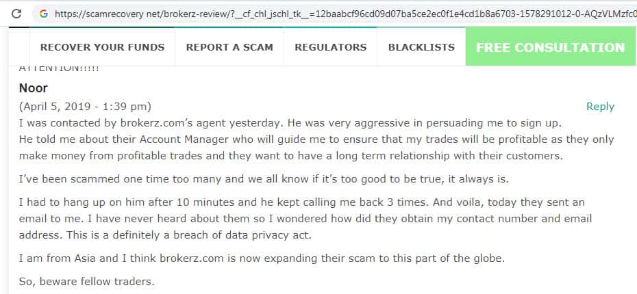 - Сообщение о разрастании влияния Брокерз в сторону Азии в отзыве пользователя Noor с портала scamrecovery net