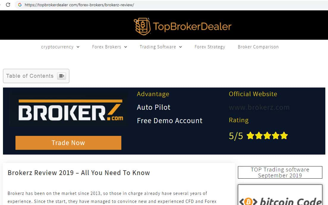 Портал binaroption com откровенно рекламирует брокерскую контору Брокерз. Вот, что говорят авторы обзора в финале их исследования компании: "Компания Brokerz является достойным брокером для заработка на финансовых рынках. Она уже имеет не один год стажа, что доказывает ее надежность. Здесь есть все что нужно для торговли, комфортные для новичков торговые условия и многое другое!"