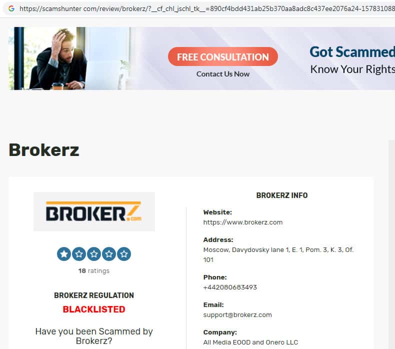 Следующим является портал scamshunter com, предупреждающий всех пользователей не иметь никаких дел с брокерской конторой Брокерз. Его сомнительная регистрация, ещё более сомнительная принадлежность к компаниям All Media EOOD и Onero LLC играет не на руку их организаторам и свидетельствует о их преступных намерениях.