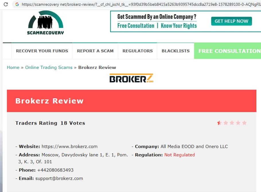 На портале scamrecovery net, публикующем обзоры и отзывы о форекс-брокерах имеется обзор и брокерской конторы Брокерз. Похоже, что ребята из Брокерз ком решили работать по-крупному. Мы уже встречали адреса размещения офисов в Греции, Болгарии, а сайт scamrecovery net публикует адрес представительства Брокерз в Москве. Но расширение географии при анализе деятельности Брокерз играет не в их пользу.