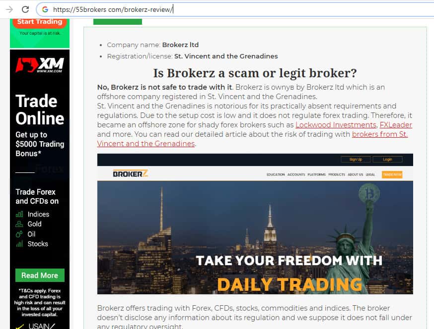 Обзор брокерской конторы Брокерз на портале forexbrokerz com содержит оценку как положительных качеств портала брокера, так и упоминает о сомнительной регистрации управляющей компании на Сент Винсент и Гренадинах. Поэтому, несмотря на положительное впечатление от сайта, автор всё же не рекомендует открывать счета на brokerz com.