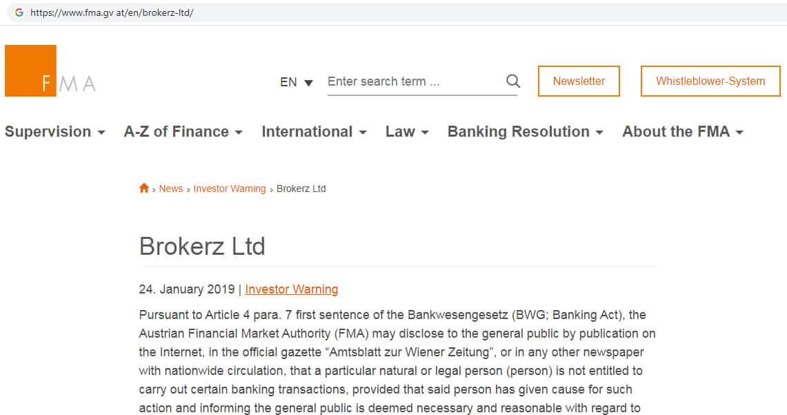 Финансовый регулятор Австрии после ряда жалоб провел следствие и запретил компании Брокерз Лимитед, управляющей интернет-ресурсом Брокерз ком проводить какую-либо финансовую или торговую деятельность на территории Австрии. Данное решение и предупреждение инвесторов было опубликовано 24 января 2019 года.