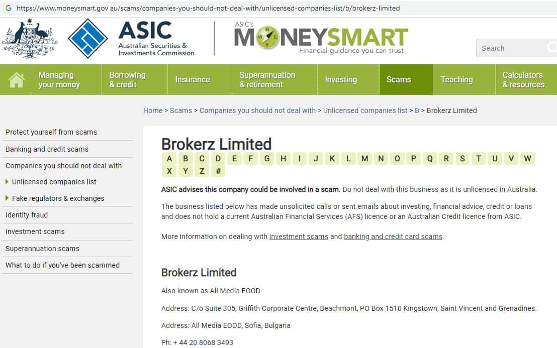 Австралийская комиссия по безопасности финансовых инвестиций опубликовала предупреждение инвесторов о возможной мошеннической деятельности брокерской компании БрокерЗ Лимитед, известной так же под именем All Media EOOD. Ни одна из управляющих компаний не имеет лицензий австралийских финансовых органов.