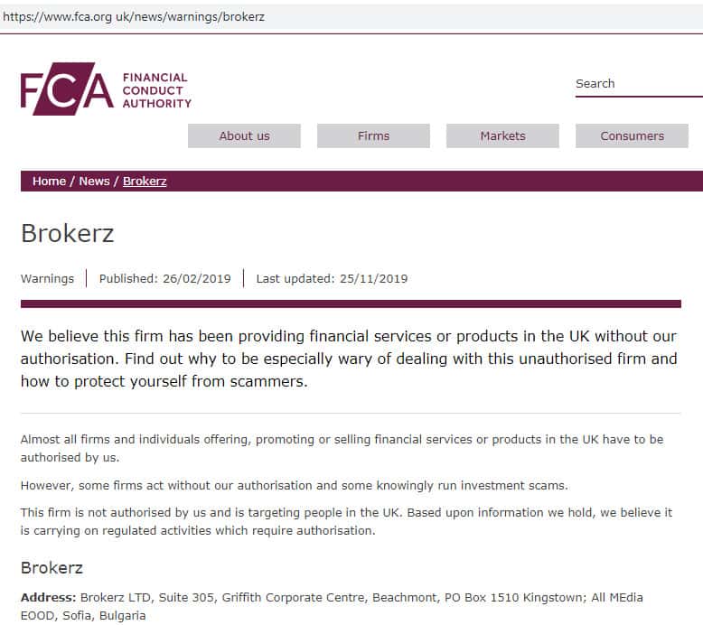 Аналогичное предупреждение для всех жителей Великобритании опубликовало Управление финансовым поведением FCA. В предупреждении указывается отсутствие авторизации компании в финансовых институтах Англии, регистрация в оффшорной зоне, что приводит к крайним рискам для всех трейдеров, соглашающихся на сотрудничество с Брокерз.