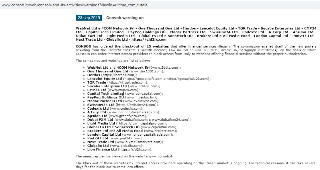 23 сентября 2019 года итальянский регулятор CONSOB опубликовал предупреждение о нелигитимной и откровенно мошеннической деятельности брокерской конторы Брокерз ком на территории Италии и дал распоряжение Итальянским интернет-провайдерам отключить доступ к порталу торговой площадки Брокерз ком с территории Италии.