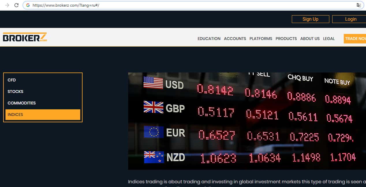 Трейдеры Brokerz могут торговать валютными парами, акциями, товарами и индексами. Для валютных пар доступны два типа продуктов :ECN CFD и фиксированный CFD, 45 валютных пар доступны для каждого типа продукта. Торговля ECN имеет плавающие спрэды, а также огромную комиссию в 8 долларов за лот, при торговле фиксированными CFD комиссия отсутствует.
