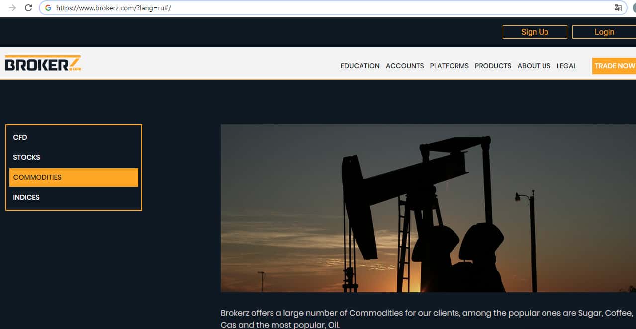 На рынке товаров для торговли на платформах Brokerz доступны семнадцать товаров, среди них обычный набор: сырая нефть, природный газ, сельскохозяйственные продукты, медь и золото. Плавающий спрэд на все товары, кроме золота и серебра, и предлагаемое кредитное плечо составляет двадцать пять процентов от кредитного плеча счета.