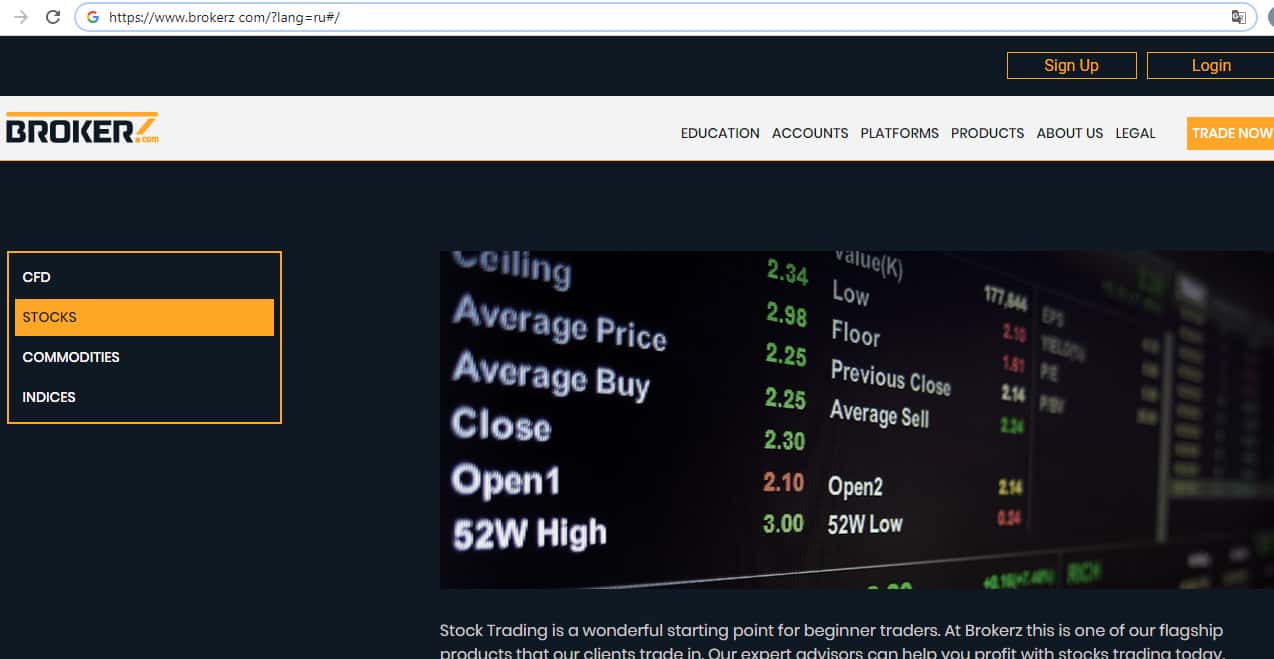 На рынке акций Brokerz предлагает акции популярных международных компаний со всего мира. Условия торговли акциями, предлагаемыми брокером следующие: спрэд плавающий, а кредитное плечо зафиксировано на уровне 1:10, комиссионных сборов не упоминается.