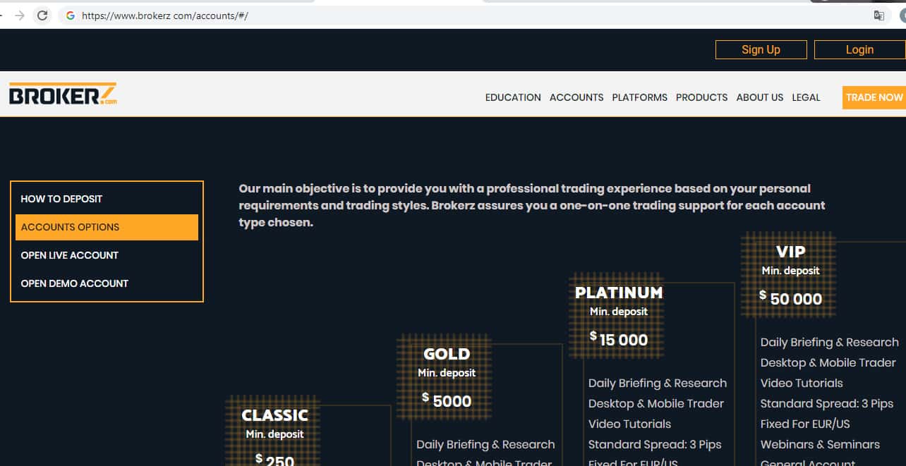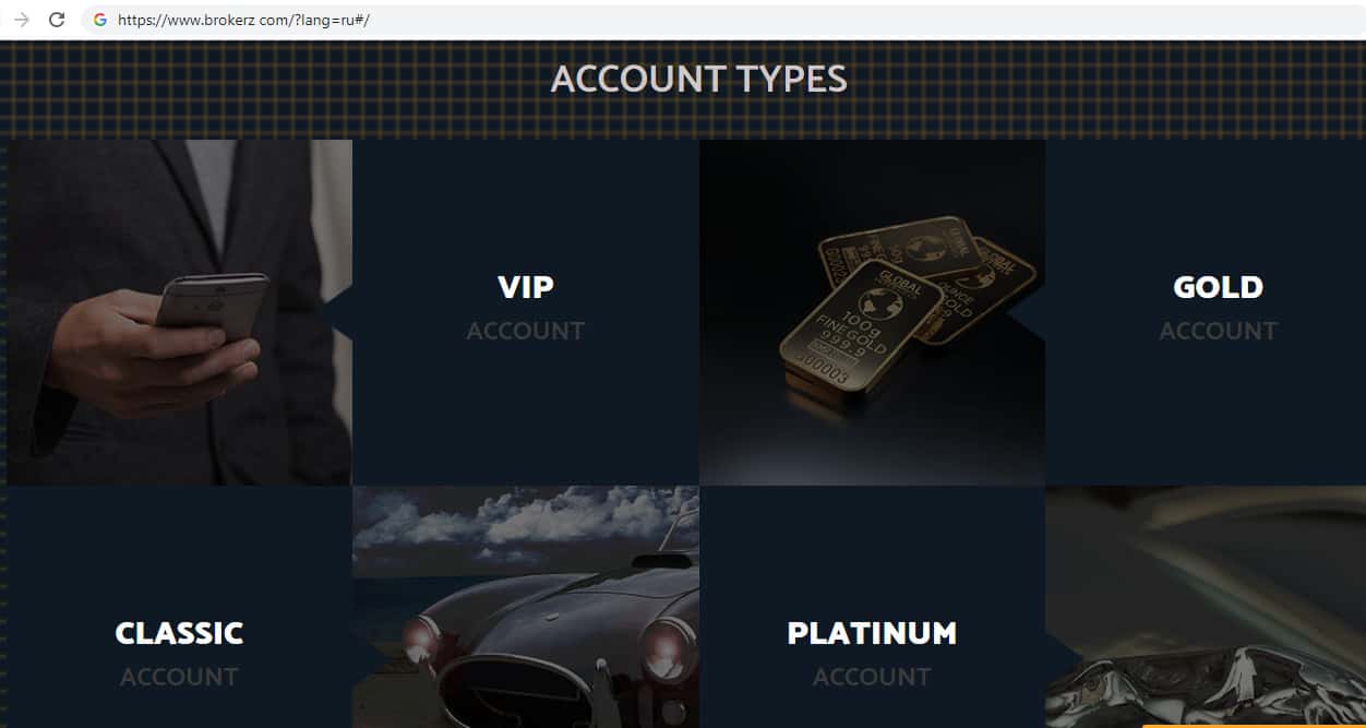 Для реальной торговли Brokerz предлагает своим трейдерам четыре различных типа счетов: Classic, Gold, Platinum и V.I.P. Каждый имеет свой собственный минимальный депозит, колеблющийся от двухсот пятидесяти долларов до пятидесяти тысяч долларов у V.I.P., и соответственно чем более продвинутый аккаунт, тем больше функций и услуг предлагается.