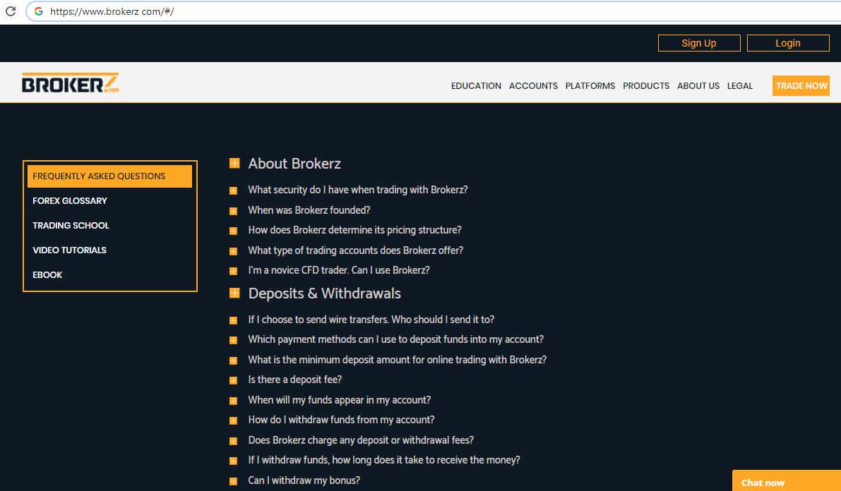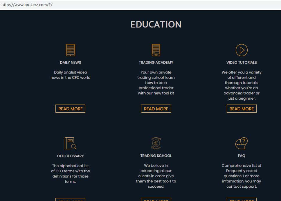 Поддержке и обучению трейдеров-новичков на портале Брокерз посвящен целый раздел. В этом разделе представлены "Часто задаваемые вопросы", "Глоссарий терминов финансового рынка", "Торговая школа", "Подборка обучающего видео" и Брошюра в формате pdf. Однако, мошенники лишь красиво заявили о своей программе обучения.