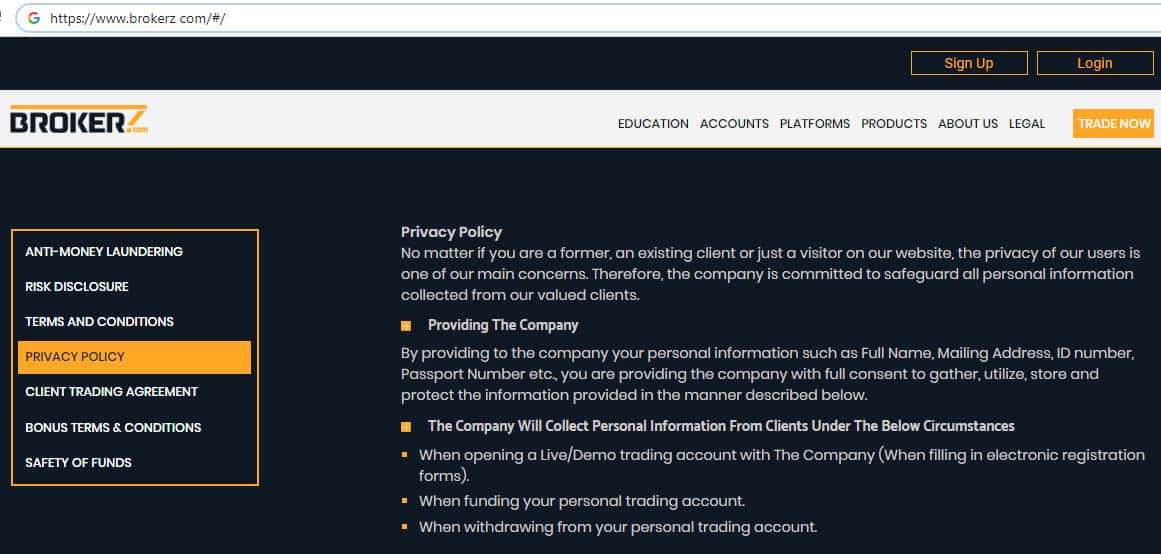 - Сбор личной информации о трейдере и конфиденциальность на торговой площадке Брокерз