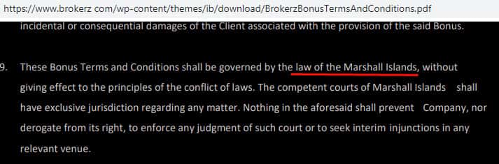 В бонусном соглашении компании Брокерз говорится, что данные соглашения подпадают под действие законодательства Маршалловых островов. Странно конечно. Одно расположение в Атлантическом океане, второе в Тихом, и расстояние без малого четырнадцать тысяч километров.