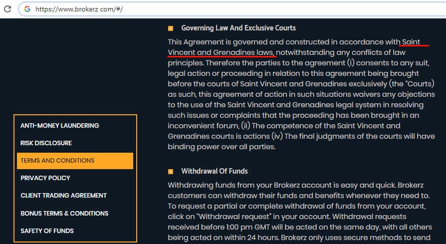 А вот в разделе "Условия и соглашения" юрисдикция брокерской конторы меняется как бы на правдоподобную. И соглашение Брокерз с трейдерами подпадает под действие законодательства государства Сент-Винсент и Гренадины.