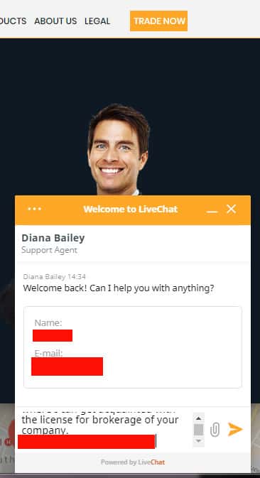Не получив ответа по вопросам регистрации и лицензирования брокерской деятельности торговой площадки БрокерЗ, мы попробовали воспользоваться живым чатом на самом портале Брокерз ком, и задали агенту технической поддержки портала БрокерЗ Диане Бейли вопрос по поводу юридических оснований деятельности портала.