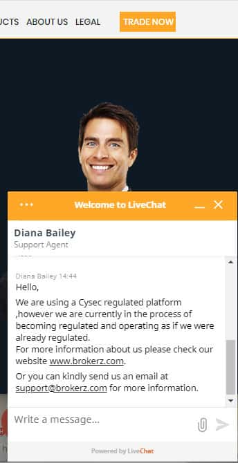 В результате запроса, Диана ответила нам, что компания Брокерз использует платформу, регулируемую Кипрской Cysec, но где можно ознакомиться с их лицензией, так и не сказала. Дальнейший текст ответа оказался не совсем понятен: то ли они проработав семь лет на рынке, они только сейчас оформляют лицензию, то ли ещё чего. но вся информация имеется на сайте.