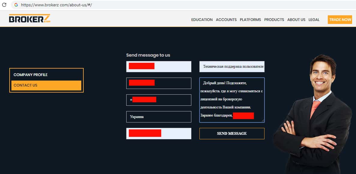 После получения не совсем правдивого ответа в чате о лицензировании компании Брокерз мы попробовали оставить запрос на форме обратной связи на контактной странице портала Брокерз. Проверка работы технической поддержки дала неясный результат. То ли техническая поддержка совсем не работает, то ли у нет нет желания отвечать на наш вопрос о лицензировании компании.