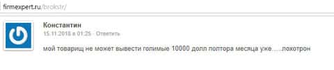 Следующий автор письма рассказал, правда коротко, о том, как контора Brokstr опрокинула его друга и отказывается выводить ему свыше 10 000 долларов. Как человек только не пытался добиться правды и вывести деньги, все бесполезно. Поэтому стоит конкретно подходить к вопросу выбора брокера. Как бы они себя не позиционировали, все нужно проверять и читать отзывы - везде есть свой подвох.