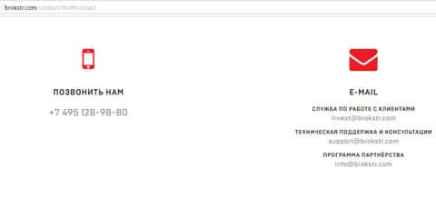 Если вам потребуется связаться с форекс-мошенниками Брокстр, то они выставили у себя на сайте почты и телефон. Конечно же в случае кидка с их стороны, вам никто не ответит га письма, а телефон заблокирует. Так что не стоит рассматривать такую открытость в качестве маяка доверия - это все сделано как раз для привлечения новичков к себе в лохотрон. Ниже представлены контактные данные: