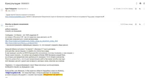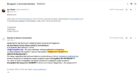 Очередной клиент повелся на доводы звонарей из мошеннической кухни BronzeMarkets и вложил порядка 500 долларов. Поначалу шарлатанам этого хватало, но уже спустя пару дней, они стали выпрашивать вложить еще 60 000 рублей. После этого наглежа, клиент написал подробную жалобу в организацию ChargeBack.Me где работают высококвалифицированные специалисты и знают как выйти сухим из этой неприятной ситуации.