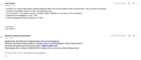 С Натальей лохотронщики применили свой излюбленный прием – дали возможность вывести немного денег, в ее случае это было 100 долларов, а затем стали вовлекать в «более выгодные» по их словам сделки. С 10000$ обещали «поднять» свыше 30000$. После того, как женщина почувствовала неладное, стали уговаривать, «давить на жалость», а когда это не сработало, просто исчезли вместе с деньгами клиентки. Пока женщина оплакивает свои деньги, кинувшие ее псевдоброкеры Михаил Соколов и Руслан Закирович, скорее всего, обкрадывают других лопухов из сети.