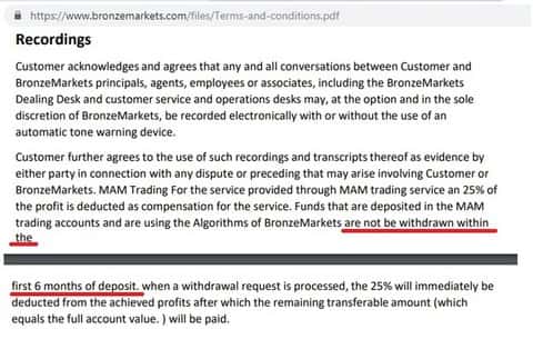 Для того чтобы пустить пыль в глаза своим клиентам, Бронз Маркетс предлагает им заключить договор. В нем прописаны все условия и сроки сотрудничества между сторонами. На первый взгляд в договоре все кажется довольно разумным и правильным, поэтому мало у кого хватает терпения прочитать внимательно все 17 страниц этого жульнического соглашения. Какого же оказывается удивление подписавшего бумаги юзера, когда обнаруживается, что по договору он не может вывести деньги в течение первых 6 месяцев после депонирования средств. Если же клиент будет настаивать на своем, ему придется заплатить фирме целых 25% от суммы.