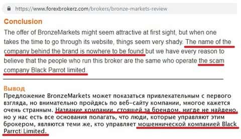 Основываясь на своих исследованиях другой проект forexbrokerz com вынес аферистам печальный вердикт. Как оказалось, бренд BronzeMarkets, с таким привлекательным с виду сайтом, всего лишь теневая контора известной жульнической корпорации Black Parrot Limited. Эта организация с оффшорами на Маршалловых островах не имеет ни лицензии, чтобы заниматься брокерской деятельностью, ни совести, что позволяет ей вновь и вновь облапошивать наивных клиентов.