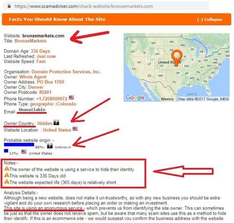 На сайте лохотрона под названием Бронз Маркетс нет ни слова о владельцах бренда, и этот пункт снова настораживает. То есть услугу клиентам оказывает некий аноним? А вот какая официальная информация есть об этой шайке-лейке на портале скамэдвайзер ком, отслеживающем нечестные брокерские конторы по всему миру: недоступный e-mail, абсолютно другой номер телефона, чем тот, который указан на сайте. Владелец использует специальную службу, чтобы скрыть свою личность и местонахождение. Все данные по BronzeMarkets говорят о том, что это поддельный веб-сайт, используемый мошенниками.