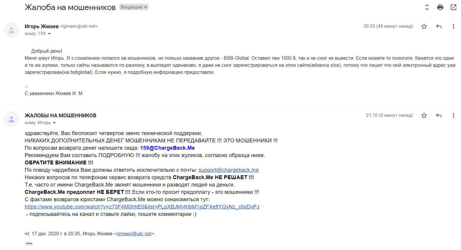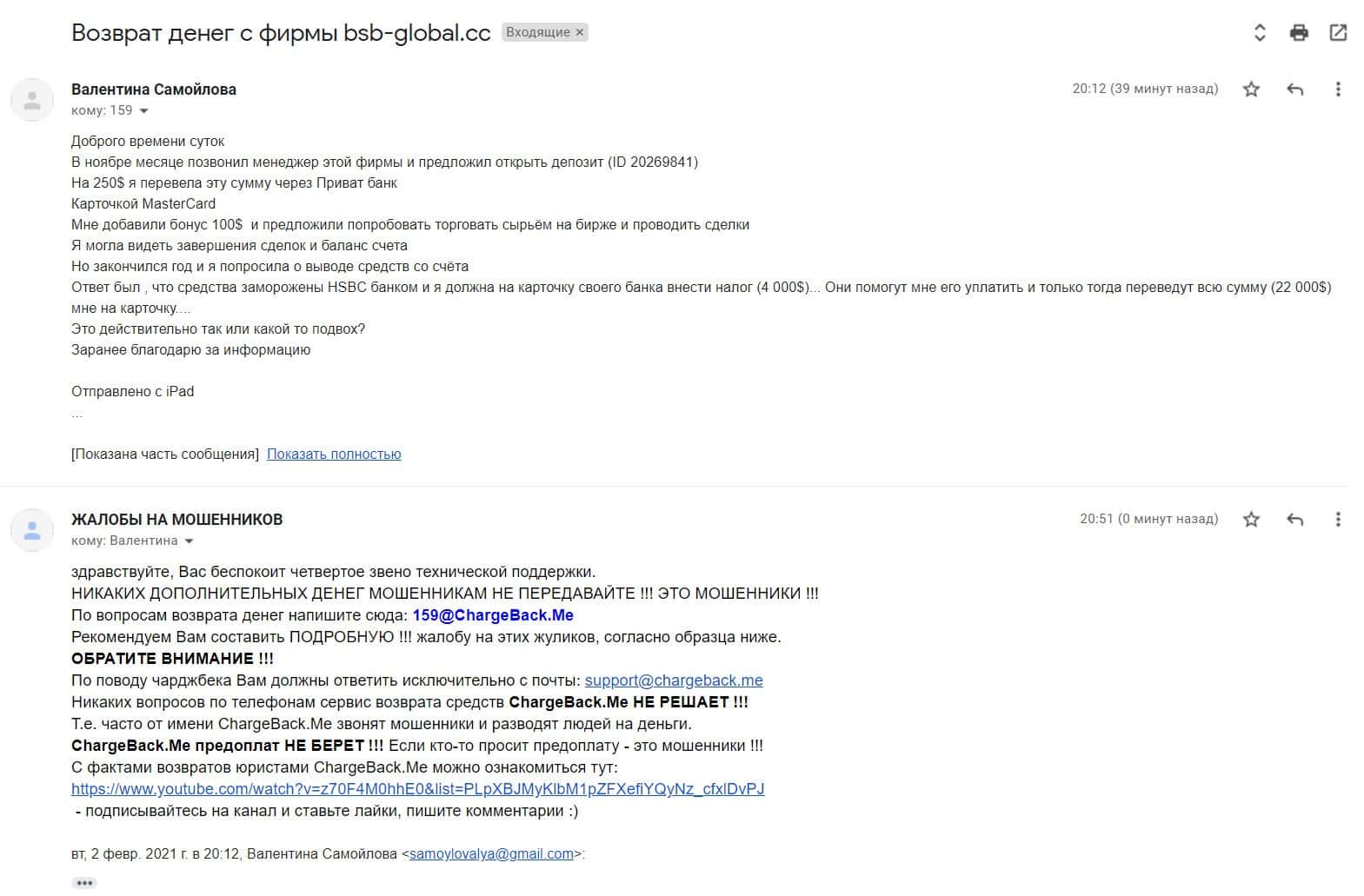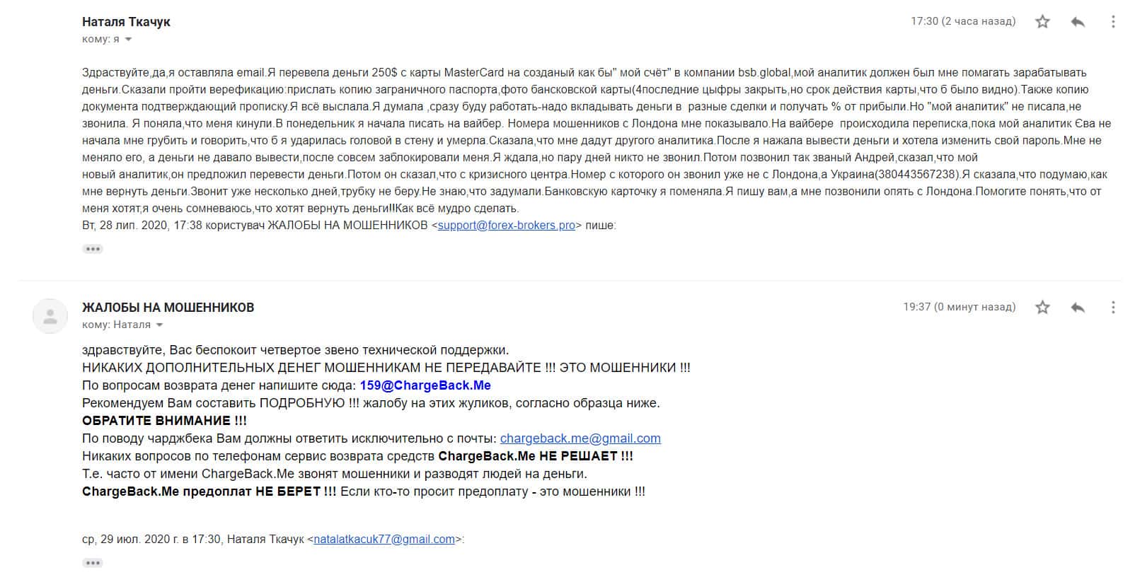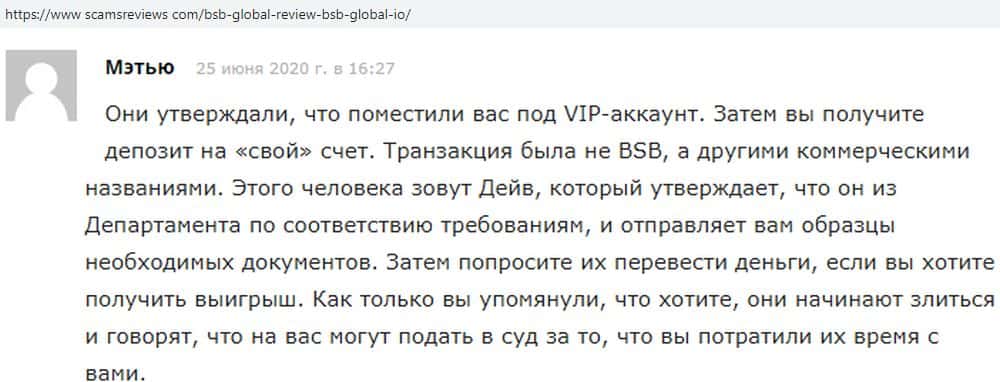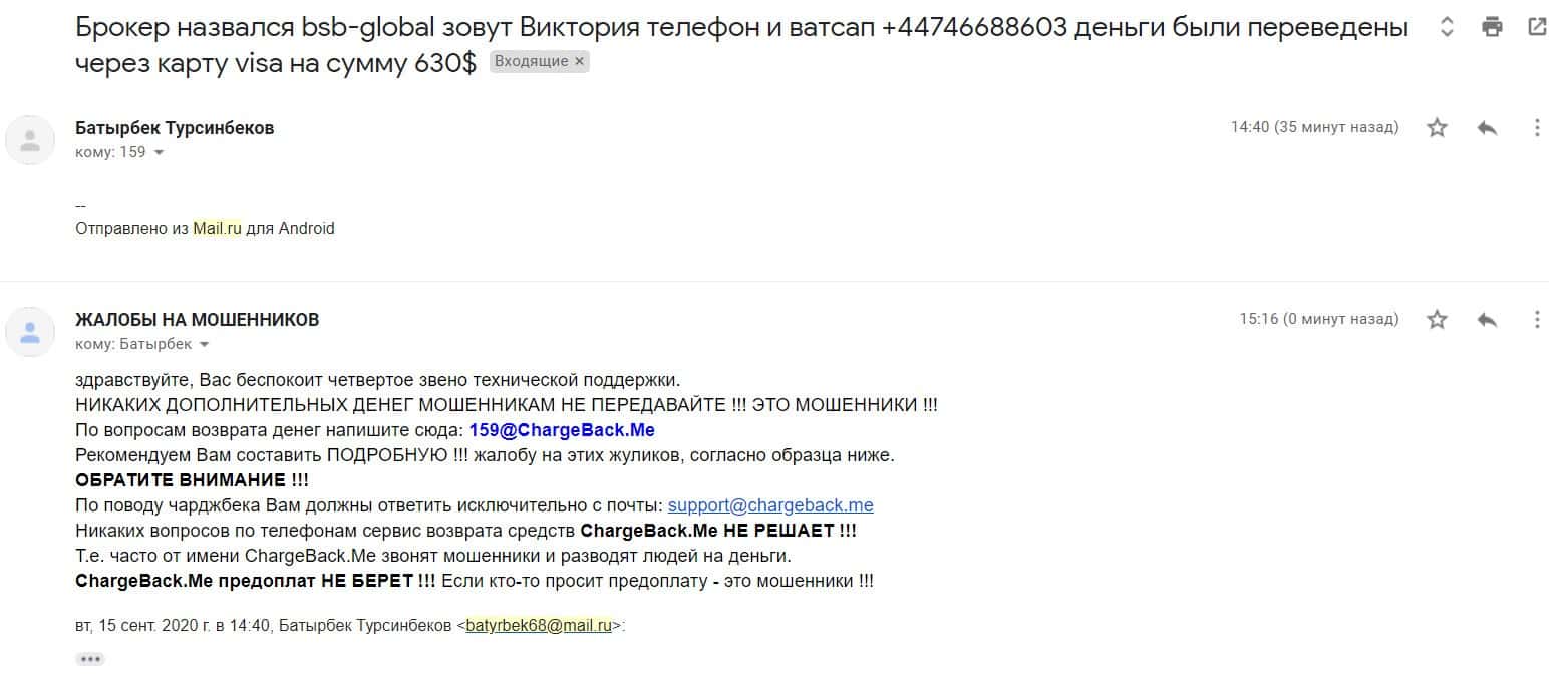 В данном разделе предлагаем увидеть информационный материал в виде жалобы на скам-контору БСБ Глобал, которая развела клиента на немалую сумму денежных средств.
