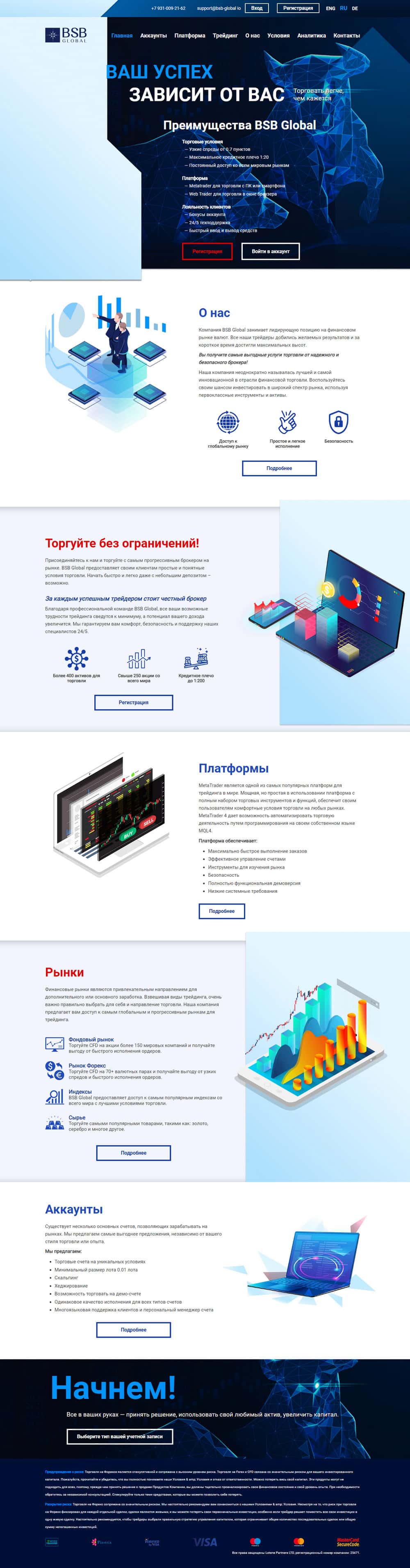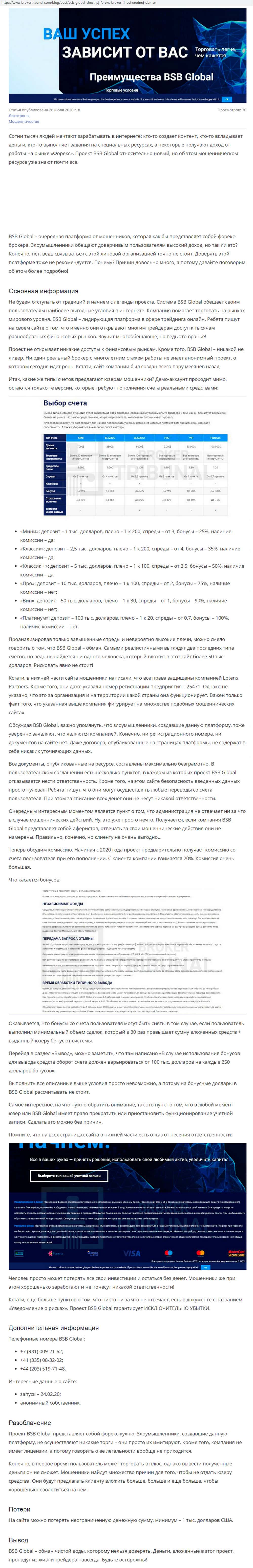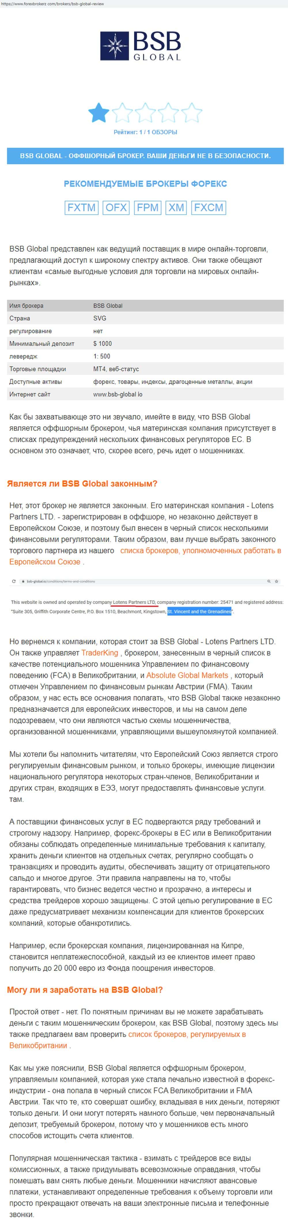 БСБ Глобал - типичный брокер-однодневка, созданный для разводя трейдеров-новичков. Это не самостоятельная афера, она находится под управлением конторы Lotens Partners LTD, которая создала еще и такие лохотроны, как AG Markets, TradeKing, Парагон (paragon-finance io) и возможно связана с аферой MaxiMarkets. Жулики используют для развода скам-платформу MetaTrader4 авторства жуликов MetaQuotes, при помощи которой сливают депозиты. Ни в коем случае нельзя пополнять счет у этих мошенников, они не выводят деньги!