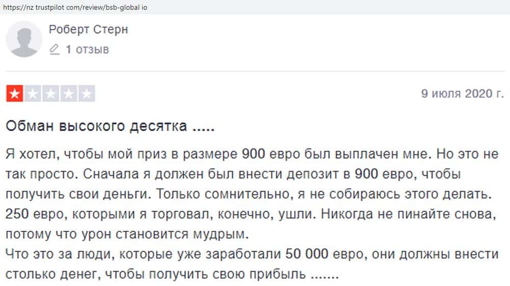 После запроса на вывод, жулики BSB-Global io начинают требовать пополнения счета - якобы, без этого деньги вывести нельзя. Если трейдер соглашается, он теряет всю сумму.