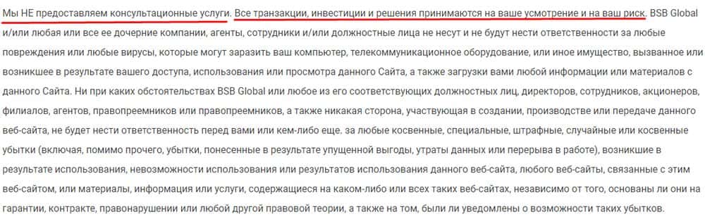 Мошенники БСБ Глобал в соглашении прописывают, что не предоставляют консультации или управление (хотя на сайте сказано обратное), а все советы - личное мнение персонала.