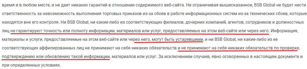 Биржевые махинаторы БСБ Глобал не гарантируют точности и актуальности информации, представленной на сайте. Они даже не считают, что обязаны ее проверять или обновлять.