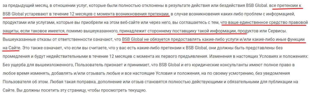 Еще один распространенный способ кражи денег - глюки платформы. За них лохотронщики БСБ Глобал тоже ответственности не несут, и это четко прописано в клиентском соглашении.