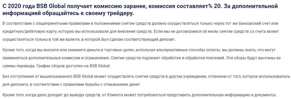 Кидалы БСБ Глобал умудрились узаконить дополнительные сборы. Они утверждают, что для снятия необходимо пополнить депозит на размер комиссии. Потом крадут все вместе.