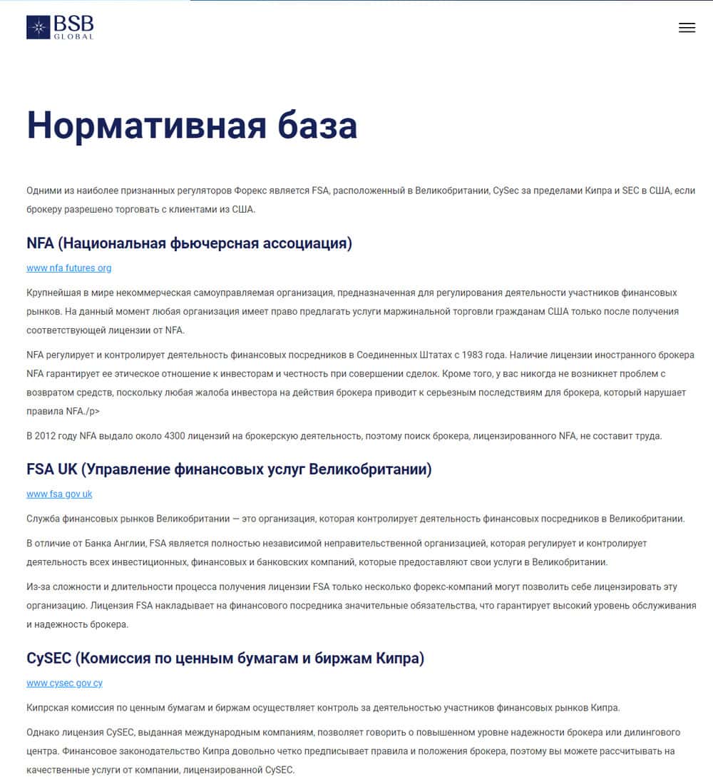 Лицензии у мошенников БСБ Глобал нет, но на сайте они перечислили всех регуляторов, так что у новичков может создаться впечатление, что липовый брокер работает законно.