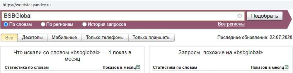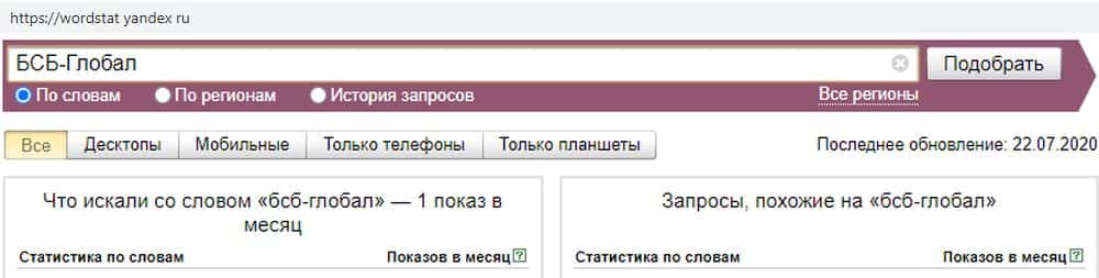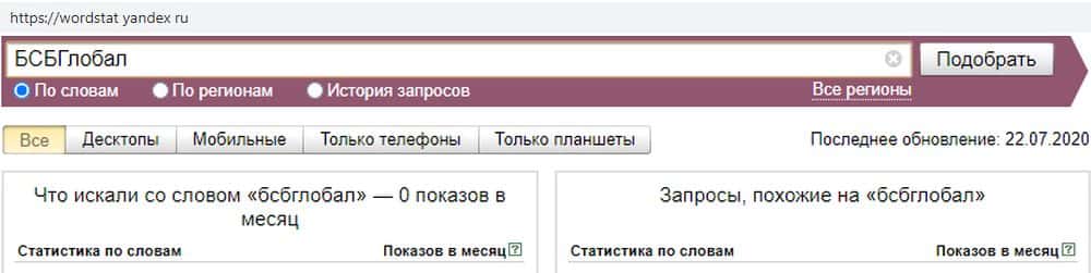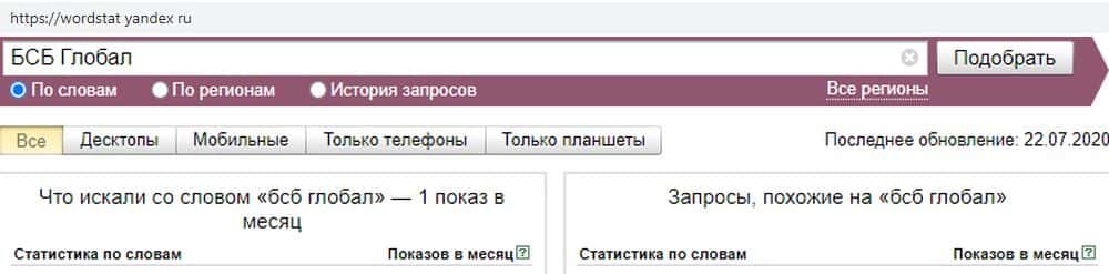 - Насколько популярен скам-проект БСБ Глобал в поисковике Яндекс?