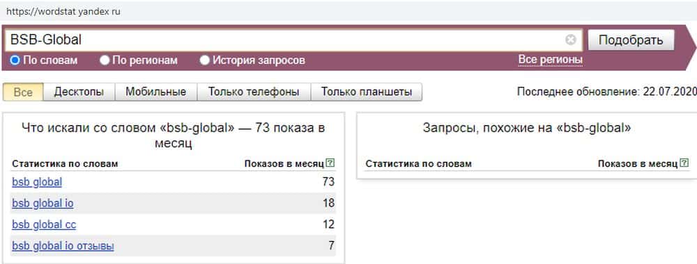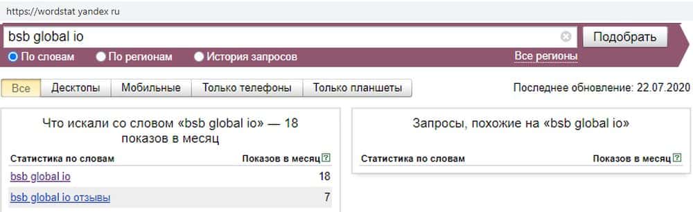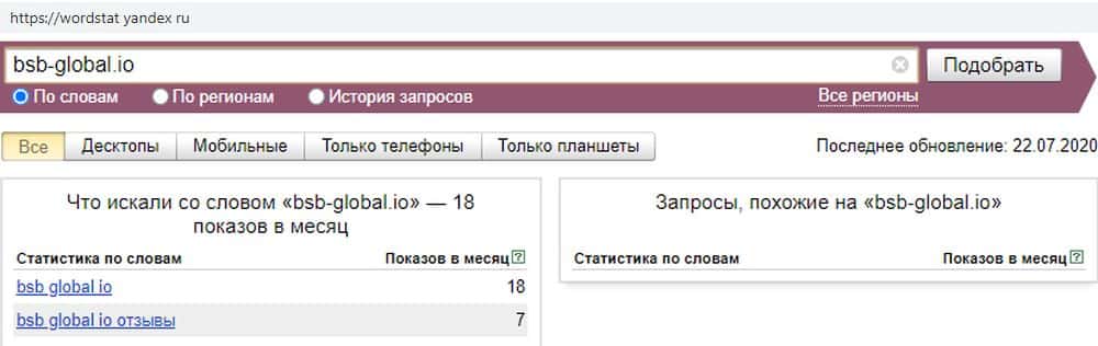 При написании домена без точки "BSB-Global io" сервис wordstat yandex ru выдает тот же результат. Этот запрос менее популярен, чем само название скам-конторы.