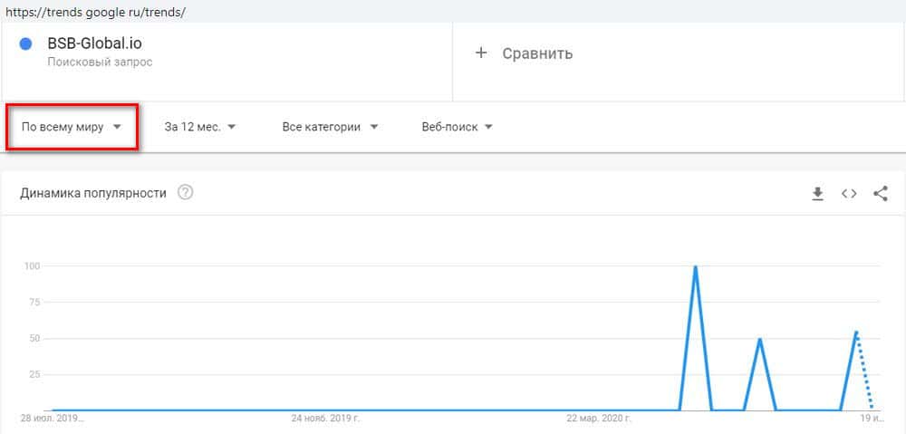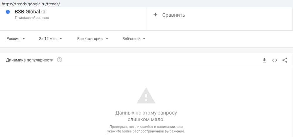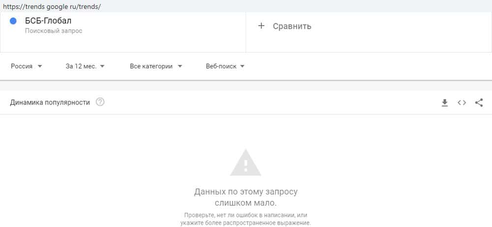 С запросом в латинской транслитерации "BSB-Global", как ни странно, ситуация та же. Как показывает сервис Гугл Трендз, никто с таким запросом за год к поисковику не обращался.