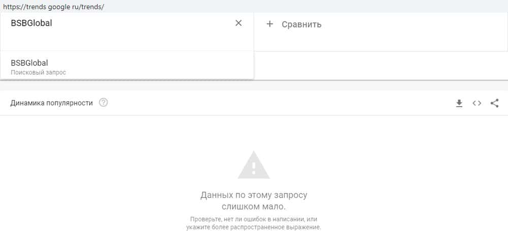 Ситуация повторяется и с запросом "BSBGlobal". Сервис не может определить динамику популярности бренда BSB-Global io из-за недостаточного количества данных.