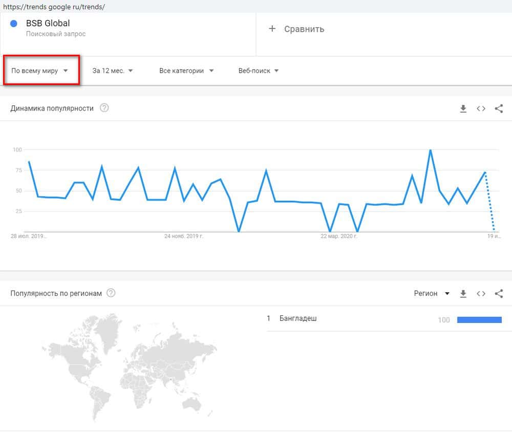 Но если просмотреть выдачу по тому же запросу "BSB Global" по всему миру, получится, что аферой БСБ Глобал интересовалось около 500 человек, причем почему-то из Бангладеша.