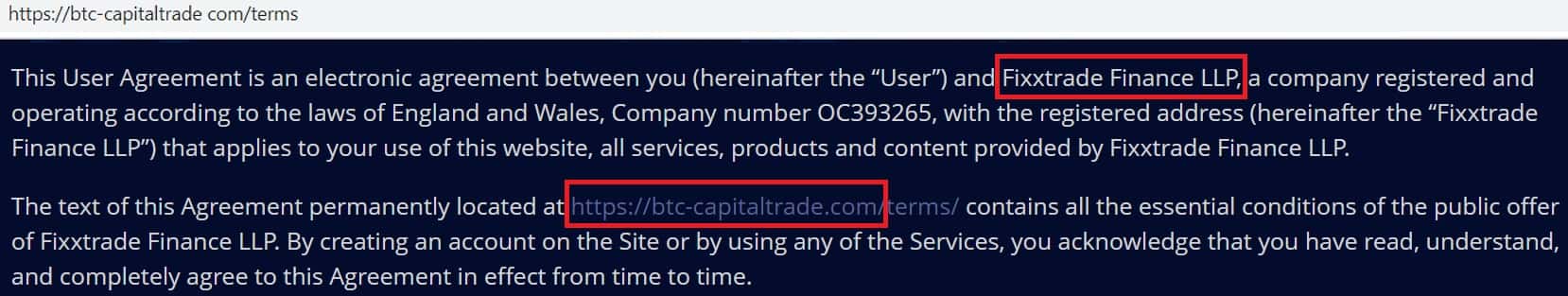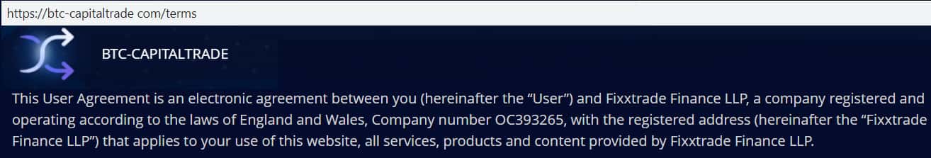 Мошеннический сайт btc-capitaltrade com принадлежит юридическому лицу Fixxtrade Finance LLP, которое владеет еще и другими аналогичными онлайн-лохотронами.