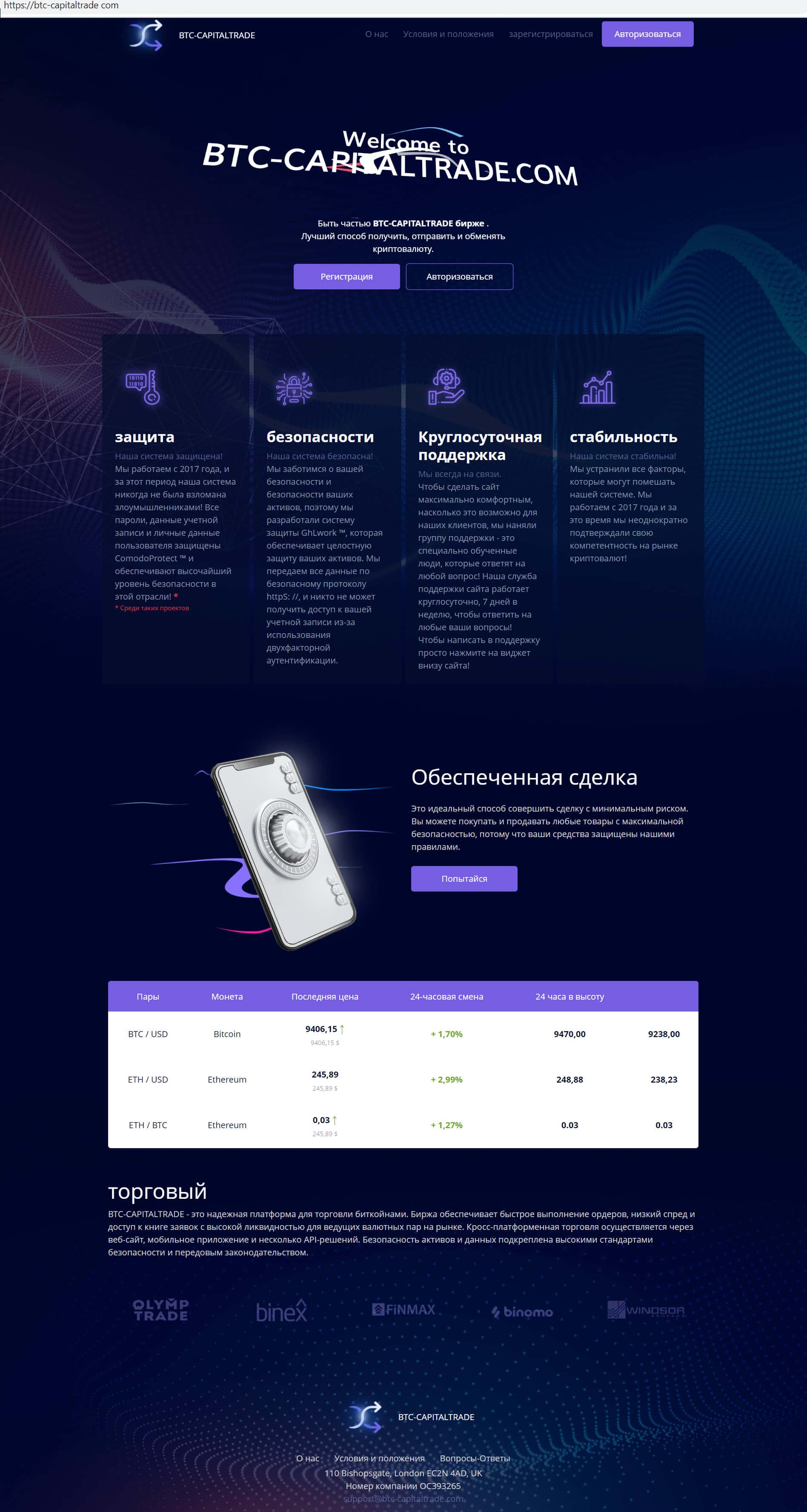 БТЦ Капитал Трейд - лохотрон, выдает себя за платформу якобы со специализацией на трейдинге с криптовалютой, но в действительности еще один сайт-мошенник по отъему средств у наивного потребителя, на который поступила жалоба пострадавшего пользователя сети Интернет, данная организация не имеет никакого отношения даже к каким-нибудь оффшорным псевдорегуляторам Форекс, является частью скам-группы, куда вошли ФиххТрейд, АФТКрипт, Эксорт, ФоксиТрейд, также BTC-CapitalTrade имеет отношение к таким псевдо-брокерам как OlympTrade, Binex, ФинМакс, Binomo и Виндзор. Призываем обходить стороной этих мошенников, если свяжитесь с БТЦ Капитал Трейд, останетесь без вложенных денег !!!